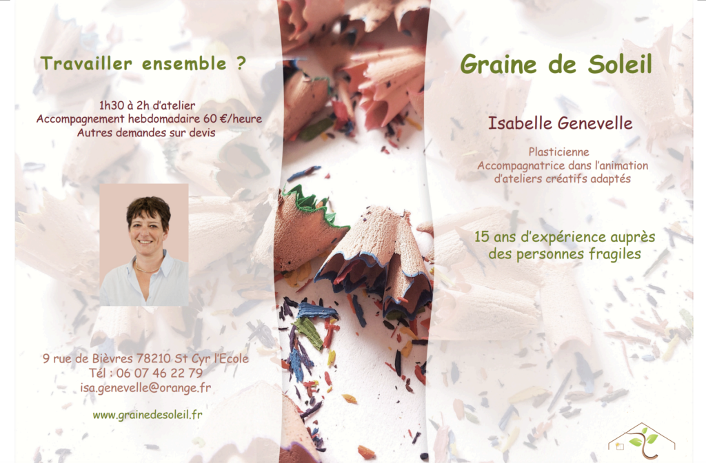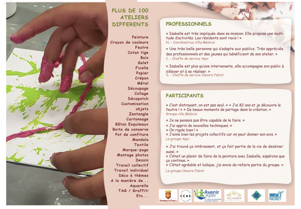 L’occasion de reprendre confiance en soi et de traduire leurs émotions. Isabelle met également à profit son expérience d’accompagnatrice dans l’animation d’ateliers créatifs destinés à des personnes porteuses d’handicap (troubles psychiques et/ou déficience intellectuelle) dans plusieurs Centres de notre département (Foyers de vie, Centre d’accueil de jour, Centres d’adaptation de la vie au travail).